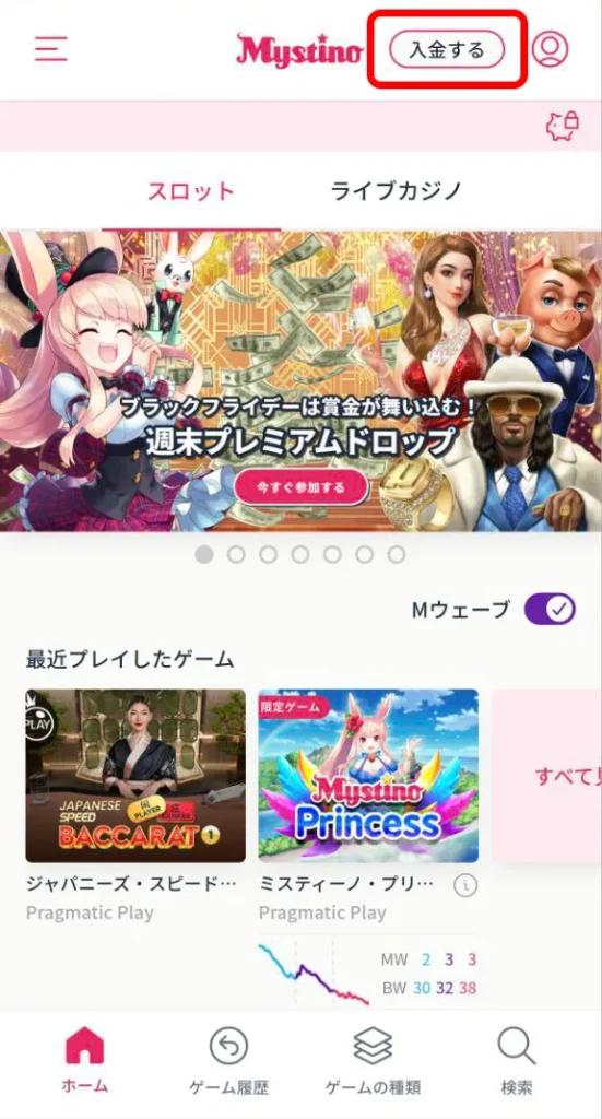 登録・ログインを完了させたら、トップ画面の右上にある「入金する」を押します。