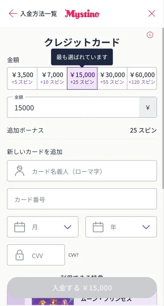 新ミスティーノカジノ(Mystino)は、初心者でも安心してプレイできるオンカジです。入金も日本人に馴染みのあるクレジットカード決済が使えます。