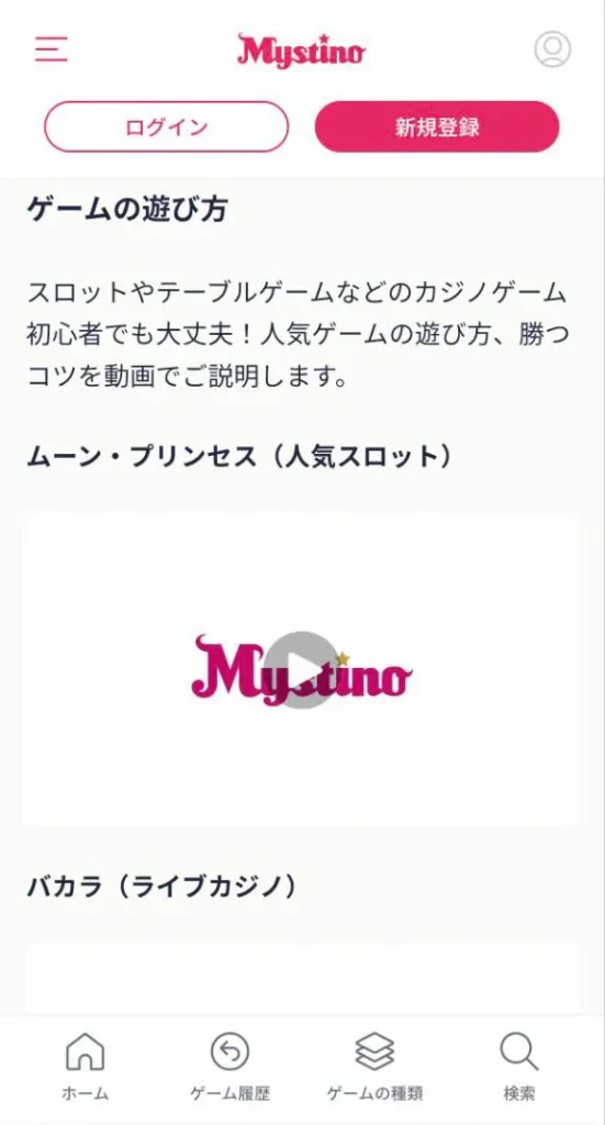 初心者向けの遊び方ガイドの動画もあるため、初心者の方でも安心です。上の画像は新ミスティーノの初心者向け遊びガイドです。