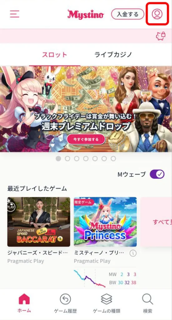 入金と同じく下のボタンから、新ミスティーノの公式HPに移動しましょう。当サイトから登録したら、5,000円の入金不要ボーナスを獲得できます。