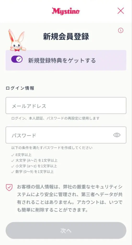 新ミスティーカジノへの登録はたった3分で完了します。ここでは新ミスティーノへの登録方法をステップごとに解説します。